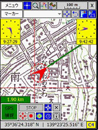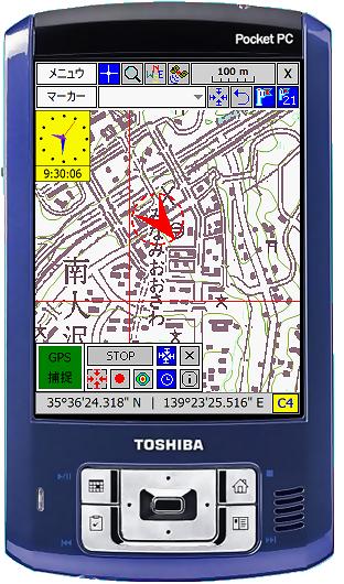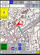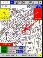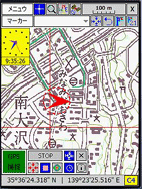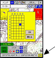 現在PDAの画面に表示されている地図はそれに対応した紙地図のどの部分かを知ることができます。紙地図の長辺を9等分、短辺を5等分してそれに記号をつけています。自分で国土地理院の地図から切り出した地図にも自動的にこの記号がつきます。